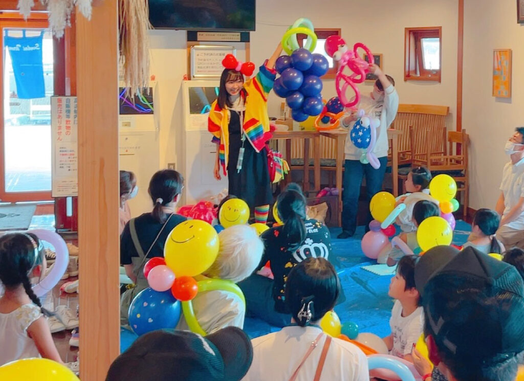 童謡や、子ども達に人気の曲に合わせ大きなバルーン作品をステージで作ります。使う曲や作る作品を季節ごとに変え、バラエティーに富んだショーをお届けします。